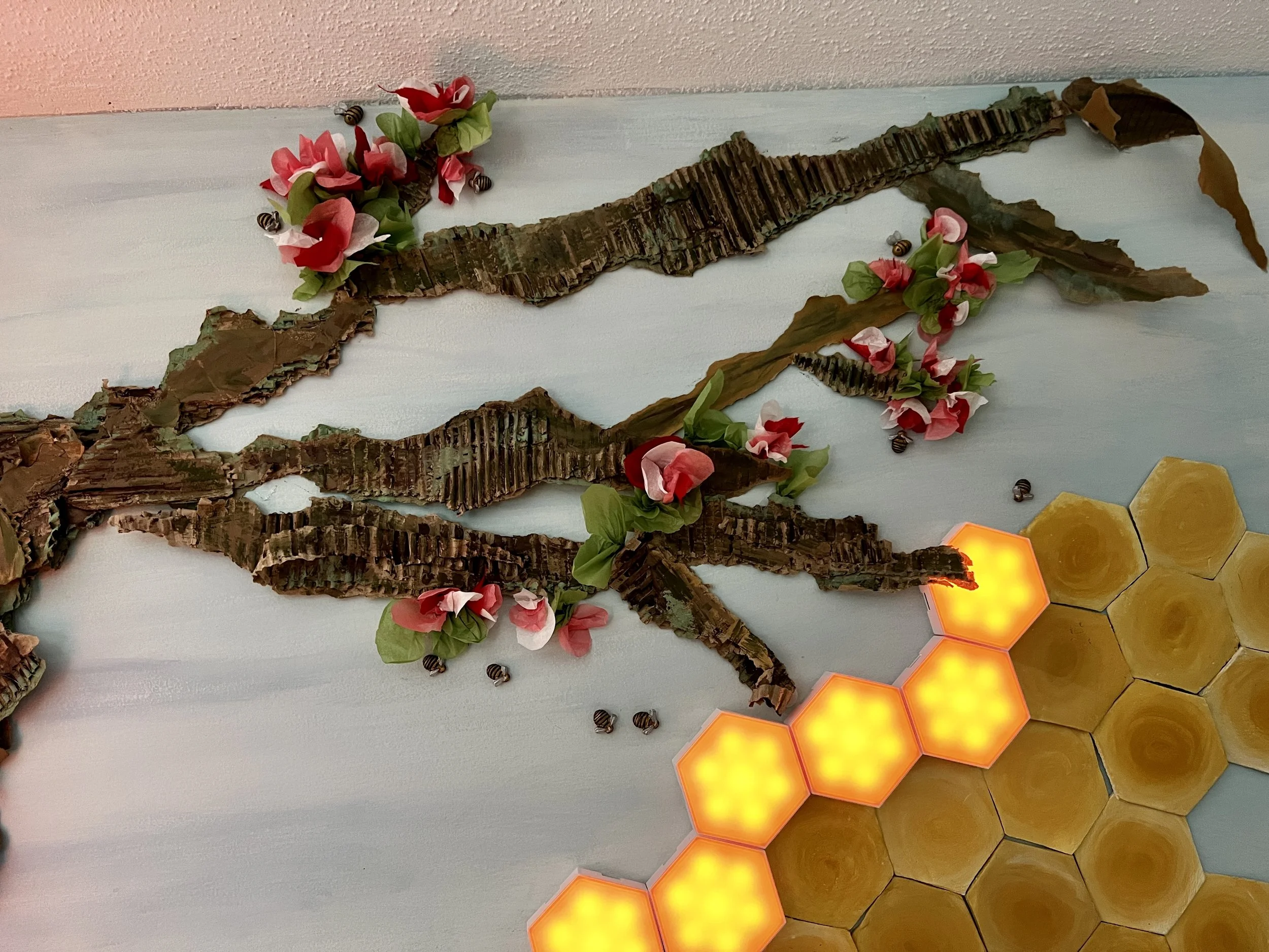 In the background: a completely removable 3D accent wall, made of a tree created with repurposed card board boxes, left over tissue paper, bees made of clay, chalk paint, and some really cool click together lights.